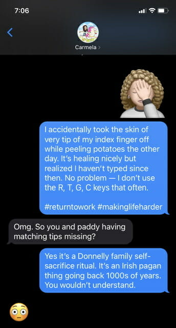 Paddy is pretty much whole again, and my finger is healing nicely too. All was fine until I sat down to do work this morning and realized I haven’t typed since then. No problem — I don’t use the R, T, G, C keys that often (◎_◎) .